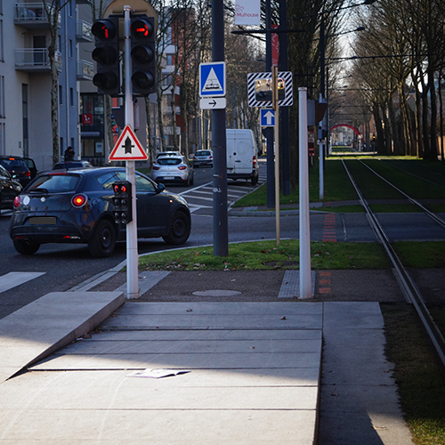 Le tramway est toujours prioritaire et la signalisation est à respecter. Attention aux rames dites croiseuses. Franchir les rails le plus perpendiculairement possible permet d'éviter de coincer la roue de son vélo, sa trottinette etc.
